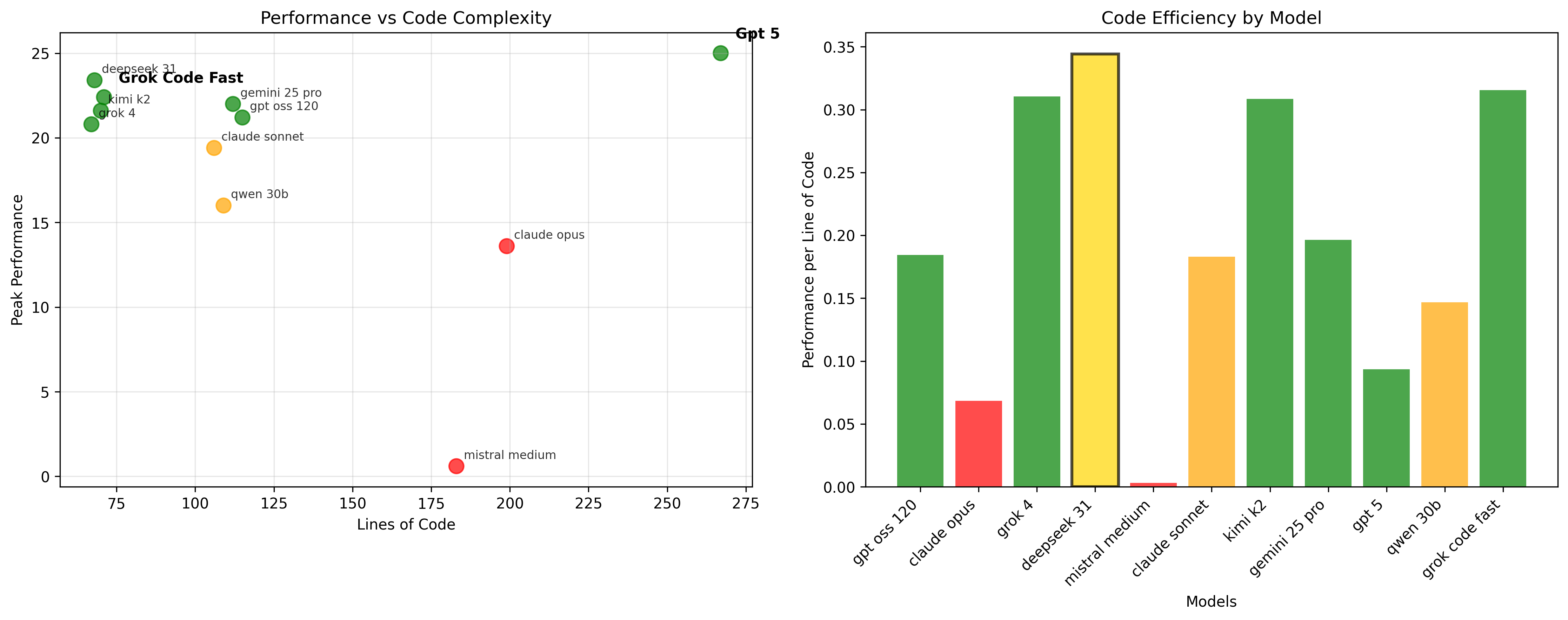 Grok Code Fast: 96 lines → 22.4 peak (0.23 performance/line)