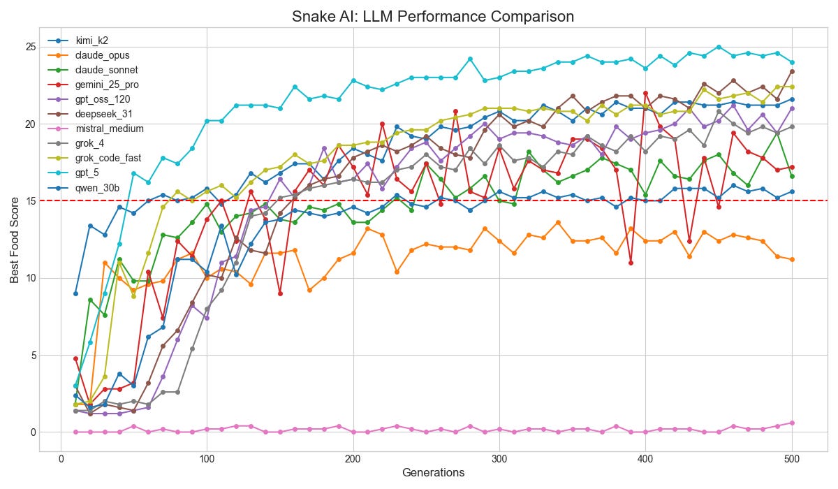 GPT-5 built a ridiculously convoluted snake game: robust environment detection, distance-based progress shaping, anti-stagnation penalties, adaptive mutation decay, blend crossover options, weight clipping. All that nuance did work; however, reaching 25.0 peak by generation 50.